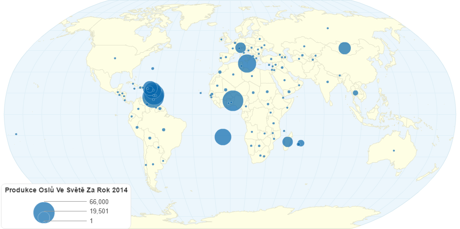 Produkce oslů ve světě za rok 2014