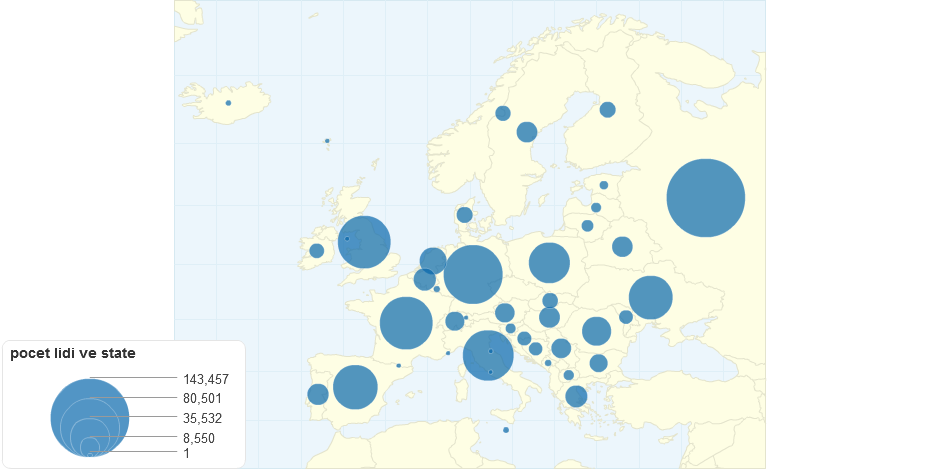 Počet lidí v jednotlivých státech Evropy k roku 2015
