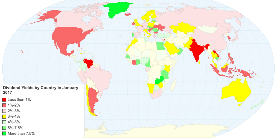 I report the dividend yields, using dividends in the 12 months leading into 2017 and the market cap at the start of 2017, and the dividend payout ratio, using trailing 12 month earnings in the denominator. These are aggregated values for each country.
