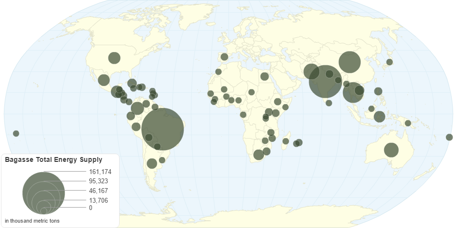 This chart shows Bagasse - Total energy supply by Country.