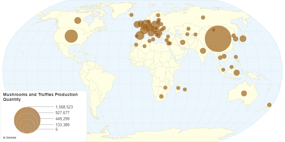 This chart shows Mushrooms and Truffles Production Quantity by Country.