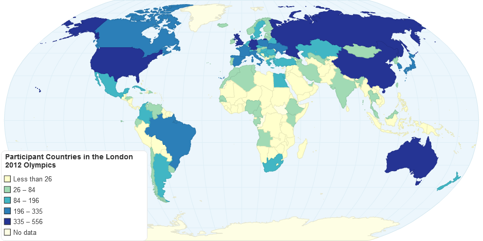 This map shows the number of athletes sent to the London Olympics by each competing nation. The data was from https://www.theguardian.com/sport/datablog/2012/jul/27/london-olympic-athletes-full-list