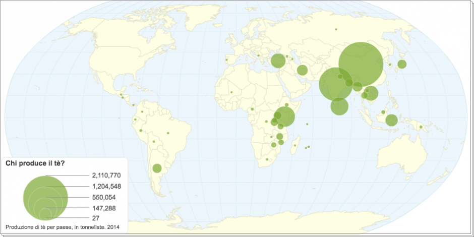 Produzione e importazione di tè per paese, in tonnellate. 2013, 1014
