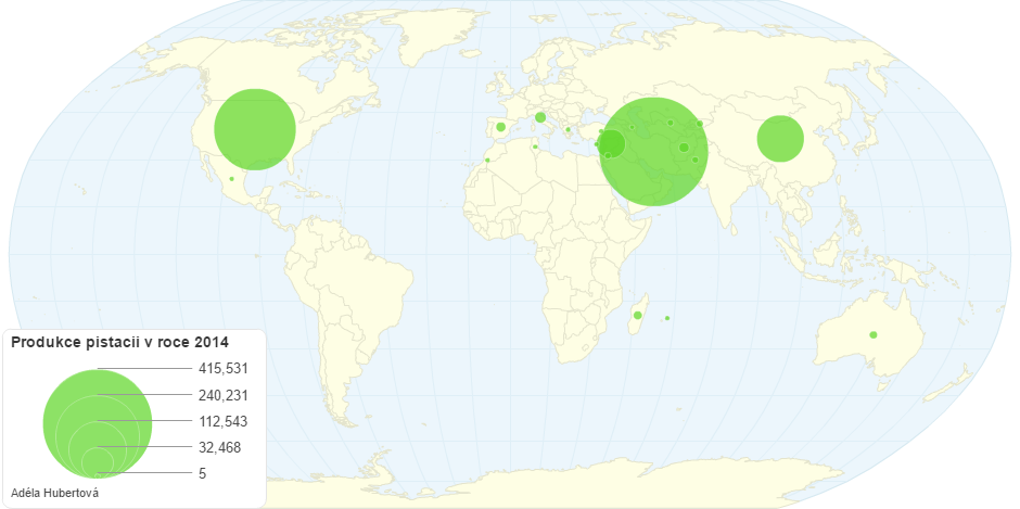 Největší produkce pistácií v roce 2014 byla v Íránu, USA a Číně.
