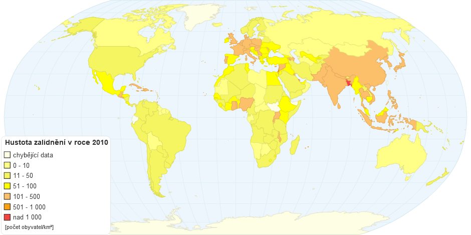 Hustota zalidnění různých států světa v roce 2010. Některé z malých států však mapa není schopná zachytit.
