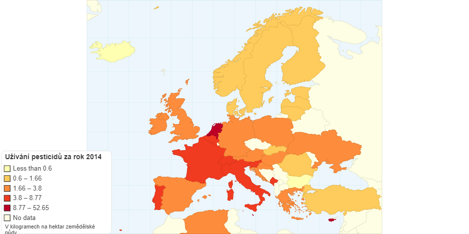 Užívání pesticidů v kilogramech na hektar zemědělské půdy za rok 2014.