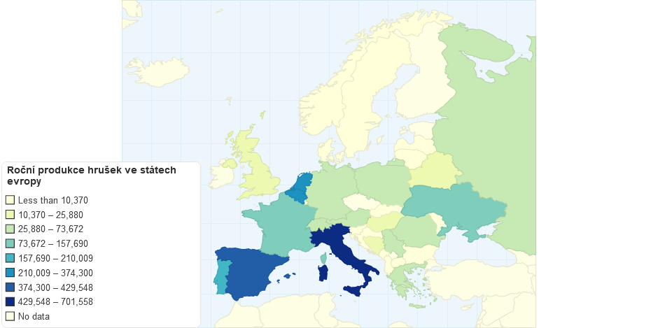 Produkce hrušek v tunách v jednotlivých státech evropy za rok 2014