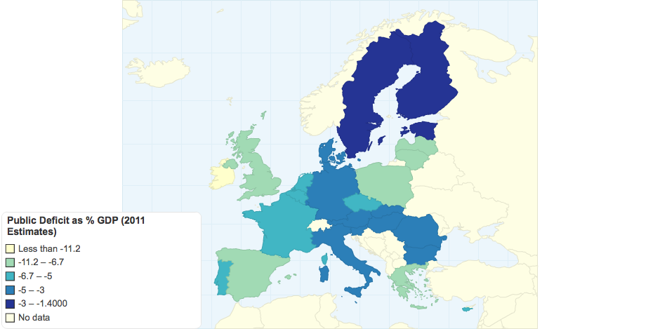 Public debt as apercentage of GDP in EU. Size of deficit is expressed in negative terms acording to scale Data is based on 2011 estimates