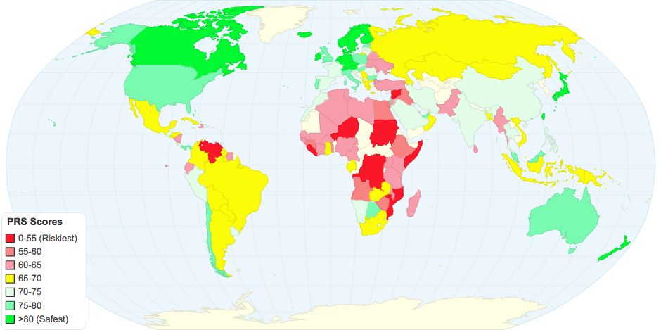 Political Risk Services (PRS) composite scores for risk, by country. Higher scores represent lower risk.