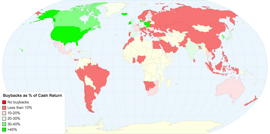 Dividend payout ratio and yield by country, with percent of cash returned in buybacks