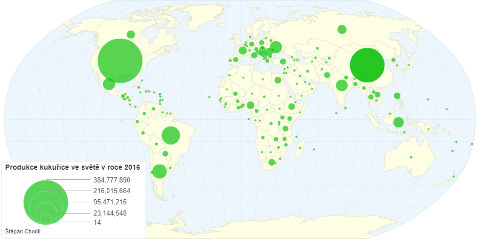 Na mapě můžeme vidět, že největším producentem kukuřice v roce 2016 jsou Spojené státy americké. V této zemi kukuřice sloužila jako potravina už od předkolumbovských dob, proto její pěstování zde má dlouholetou tradici, zejména v tzv. kukuřičném pásu. Zemědělská půda pro pěstování kukuřice tvoří asi 1/3 rozlohy USA.