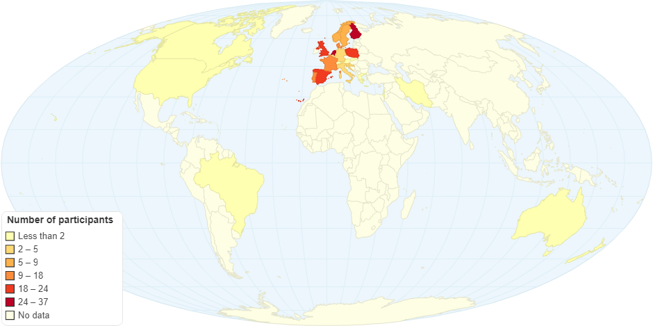 This map shows how many countries were represented in the survey and how many people from each country complete the survey.