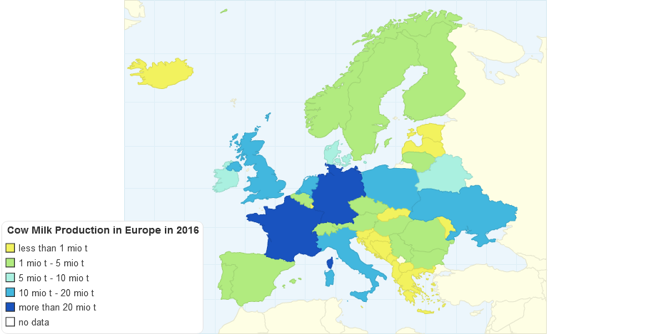 The map depicts cow milk production in tonnes of European countries in 2016 based on data from FAOSTAT.