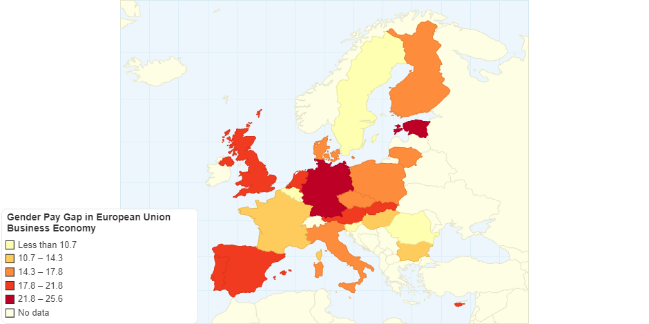 The map above illustrates a gender pay gap in business economy sector. Gender pay gap is expressed as a difference between average gross hourly earnings of male and female employees as % of male gross earnings. According to Eurostat data, the highest gender pay gap in the sector occurs in Estonia - 25.6%, and the lowest in Romania - 7%.