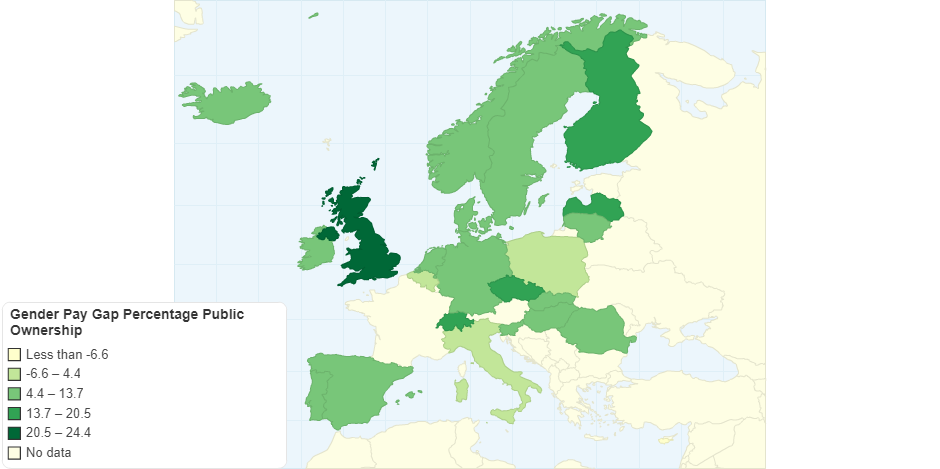 Gender pay gap regaring public ownership is the highest in United Kingdom, and the lowest ocurrs in Belgium.