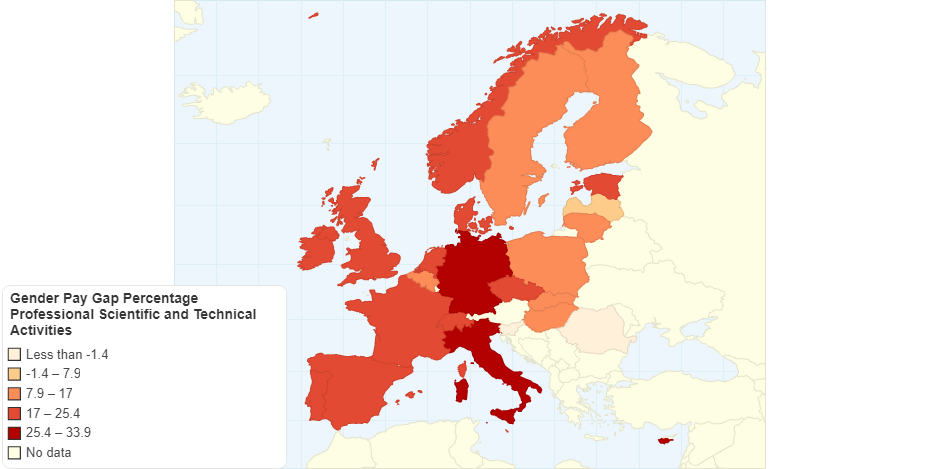 The highest GPG regarding professional scientific and technical activities is in Cyprus, and the lowest occurs in Romania -1,4%.
