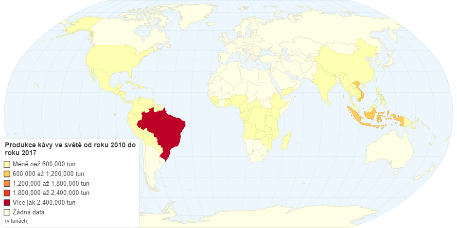 Mapa produkce kávy ve svÄ›tÄ› od roku 2010 v tunách.