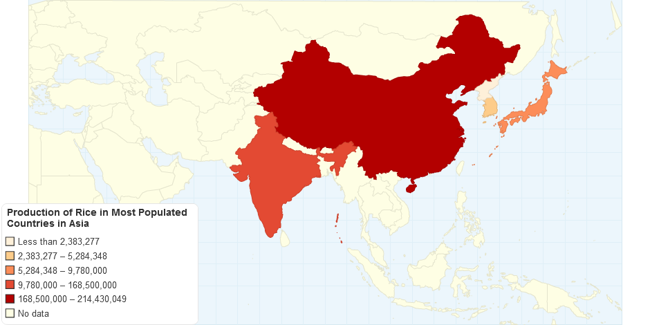 Production of rice in most populated countries in Asia