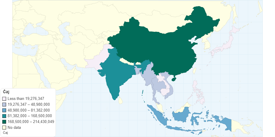 Produkce čaje v nejlidnatějších státech Asie v tunách