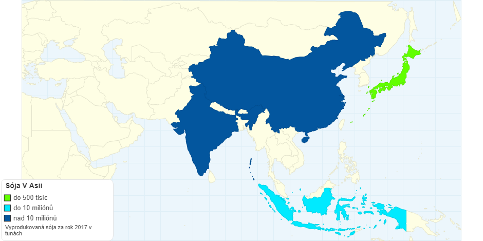 Vyprodukovaná sója v Asii ve vybraných státech za rok 2017