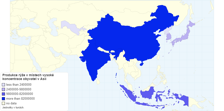 Produkce rýže v místech vysoké koncentrace lidí v Asii