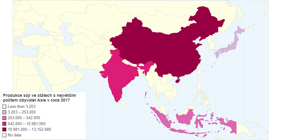 Produkce sóji ve státech s největším počtem obyvatel Asie v roce 2017