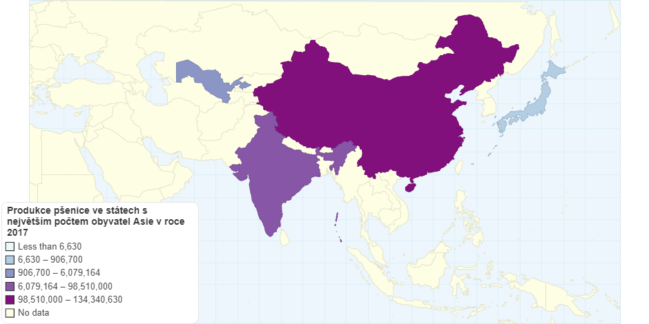 Produkce pšenice v státech s největším počtem obyvatel Asie z roku 2017