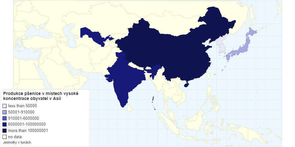 Produkce pšenice v místech vysoké koncentrace obyvatel v Asii