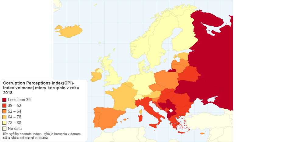Údaje pochádzajú z prieskumu agentúry Transparency Internationl z roku 2018. Čísla v mape označujú index vnímania korupcie. Je to najznámejší, najväčší a najcitovanejší index venujúci sa korupcii vo verejnom sektore. Je taktiež najcitovanejším indexom transparentnosti na svete. Ukazuje, ako je v štáte podľa občanov rozšírená korupcia či nakoľko je podľa nich štát transparentný.