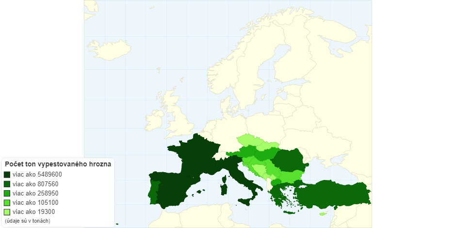 Táto mapa zobrazuje množstvo vypestovaného hrozna v krajinách Európy. Údaje sú z roku 2019.