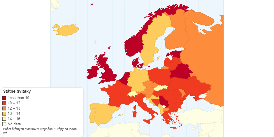 Na mape sa nachádza vyznačenie číselných údajov o štátnych sviatkoch v jednotlivých krajinách Európy za jeden rok.