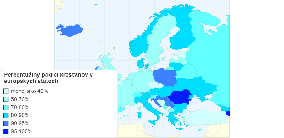 Mapa zobrazuje percentuálny podiel kresťanských obyvateľov žijúcich v európskych štátoch.