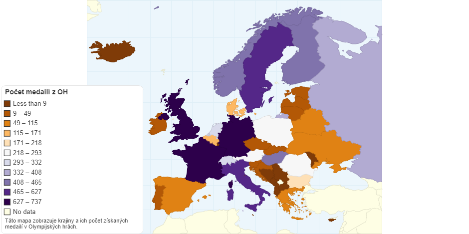 Táto mapa zobrazuje počet medailí z Olympijských hier pre dané krajiny.