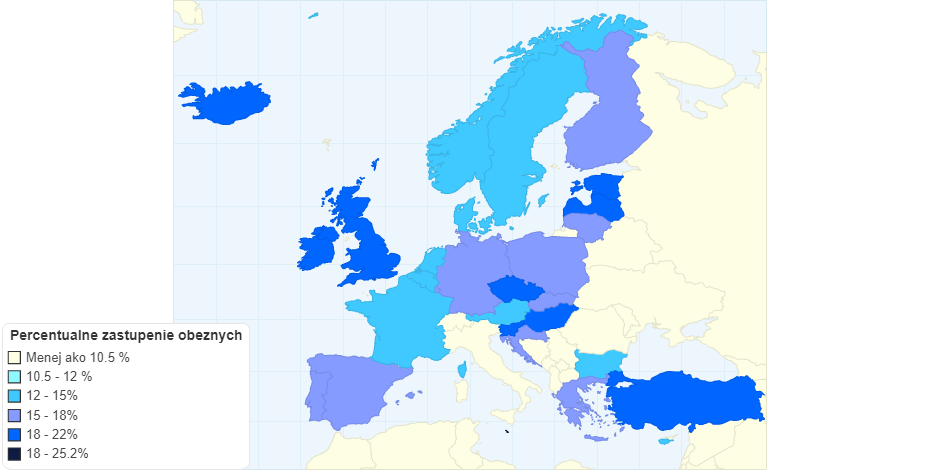 Mapa zobrazuje percentuálnu mieru obéznych ľudí v jednotlivých krajinách Európskej Únie. Zdrojové údaje pochádzajú z roku 2014.