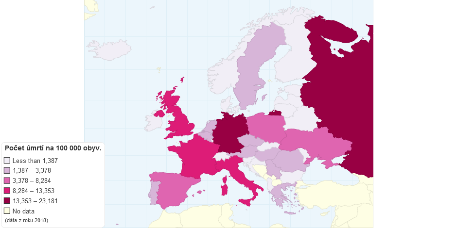 Mapa zobrazuje počet úmrtí na rakovinu prsníka na 100 000 obyvateľov v danej krajine Európy.