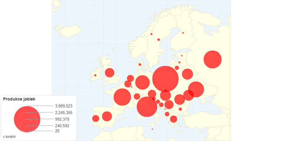 Mapa Evropy produkce jablek v roce 2018