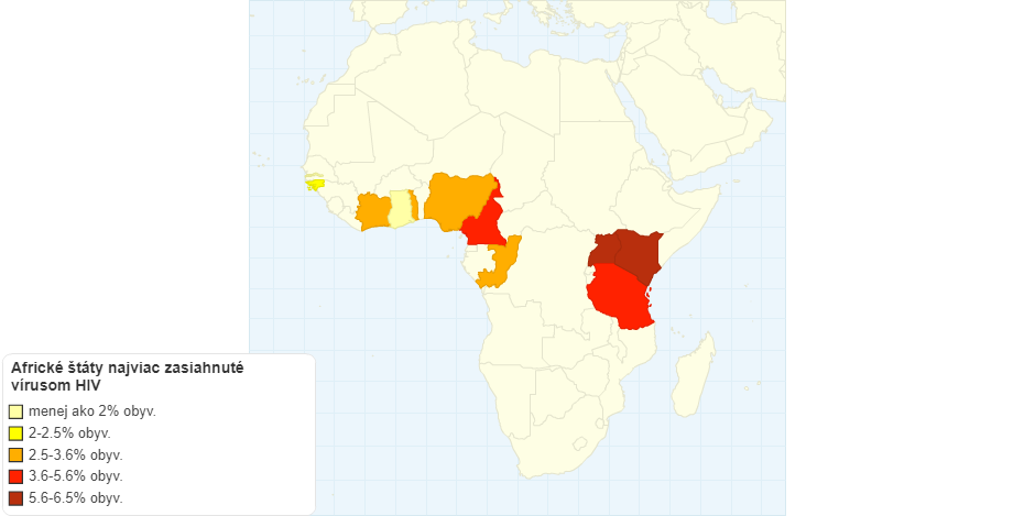 Mapa zobrazuje 11 štátov Afriky, ktoré sú najviac zasiahnuté vírusom HIV.