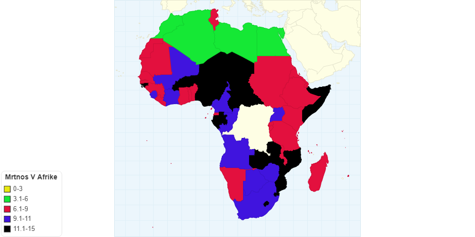 Všeobecná úmrtnosť v Afrike v roku 2020. Úmrtnosť sa počíta x na 1000 obyvateľov. Vyjde nám teda číslo ako napríklad 9,5.