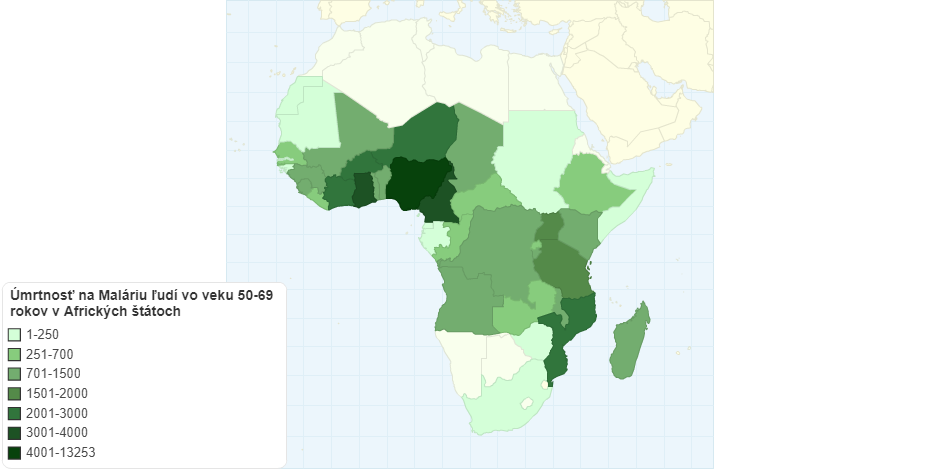 Mapa zobrazuje štáty v Afrike a počty ľudí vo vekovej kategórii 50-69 rokov, ktorí zomreli na maláriu v roku 2017. Čím je farba tmavšia, tým bolo úmrtí viac. Najsvetlejšie krajiny majú najnižšiu úmrtnosť.