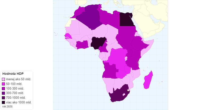 Mapa zobrazuje maximálnu výšku HDP v afrických štátoch za rok 2020