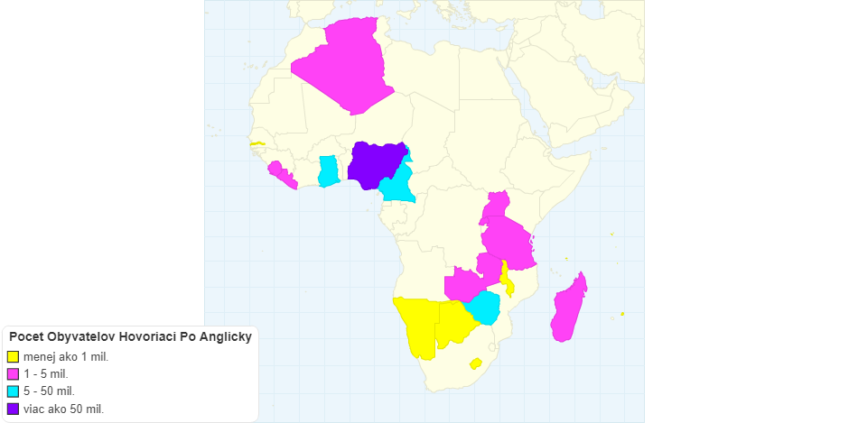 Mapa Afriky zobrazuje pocet obyvatelov hovoriacich po anglicky.
