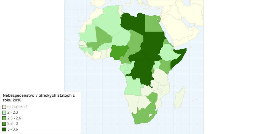 Mapa zobrazuje stupeň nebezpečenstva v afrických štátoch z roku 2016. Stupeň nebezpečenstva je zobrazený na základe násilia, nepokojov a spôsobu života v krajinách.