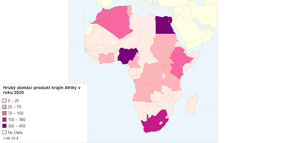 Mapa krajín Afriky, ktorá zobrazuje veľkosť HDP v miliónoch amerických dolárov v roku 2020.