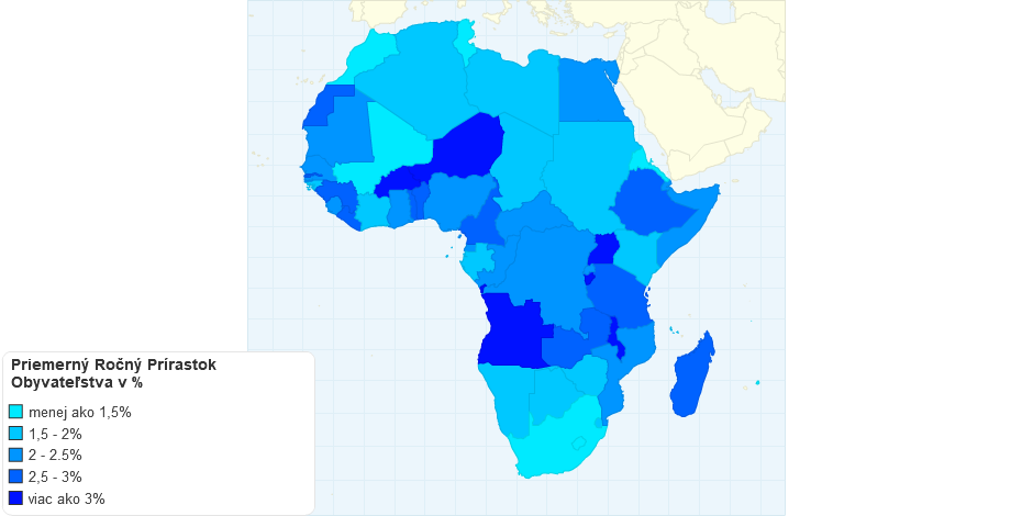 Na mape zobrazené údaje hovoria o priemernom ročnom prírastku obyvateľstva afrických krajín z roku 2017.