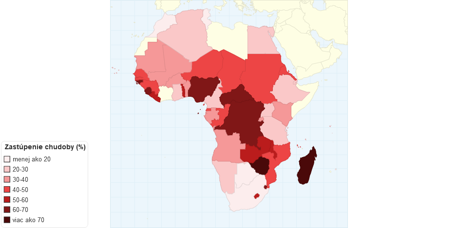 Mapa zobrazuje percentuálne zastúpenie chudoby v jednotlivých afrických štátoch.