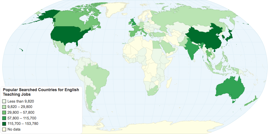 This map shows a global average of Google’s monthly searches for teaching jobs around the world. (Using the Google Keyword Tool. Compiled by GoOverseas.com.)