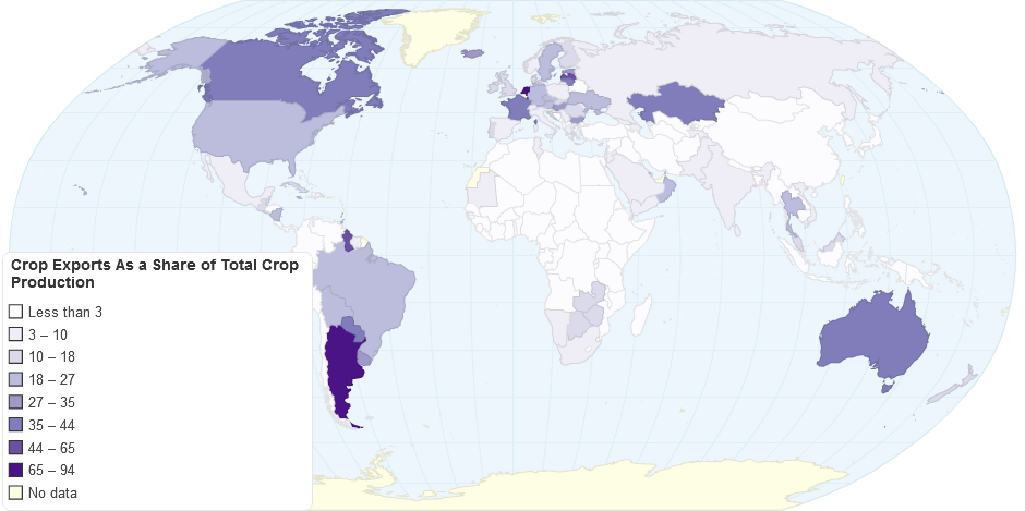 Crop exports as a percentage of total crop production. Data from FAOSTAT AGRICULTURE - Crop Production, and FAOSTAT TRADE - Crops and livestock. FAOSTAT database, Feb. 26, 2012, http://faostat.fao.org/site/535/DesktopDefault.aspx?PageID=535#ancor