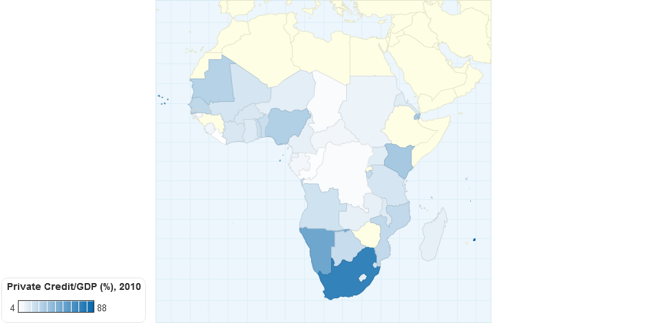 Private Credit/GDP (%), 2010 in Sub-Saharan Africa