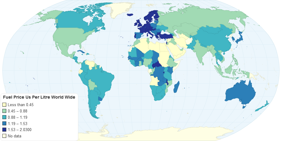 Fuel price world wide in US$ per litre, based on World Bank data 2010