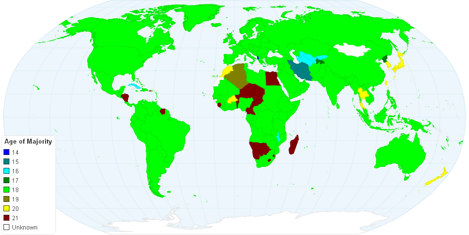 This is the Age of Majority throughout the world, which is the age at which a person legally becomes an adult. In a few countries, the age of majority for males differs from that for females; in those cases, the age for males is used. A few countries, such as the United States and United Kingdom, have different ages of majority in a few subdivisions (ex: 19 in Nebraska, 16 in Scotland). As this map can currently only divide by country, I have used the most common age of majority for those countries.
